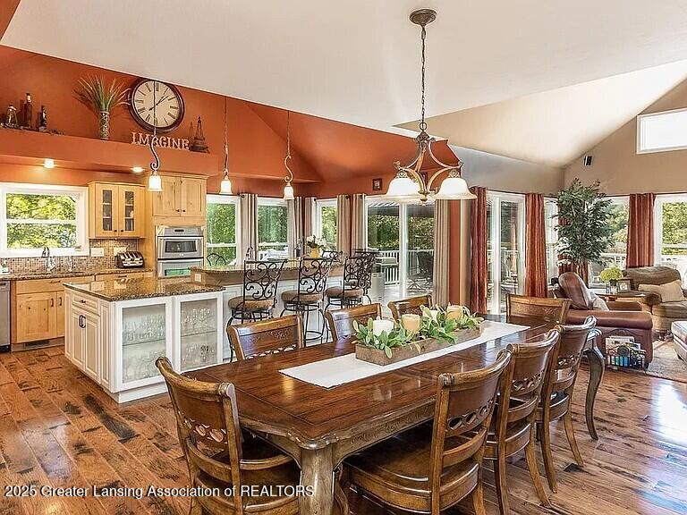 Your lakeside dream home is here! Tucked away on 2 private, wooded acres along the shores of all-sports Long Lake, this 3,832-square-foot custom-built retreat offers the perfect balance of high-end comfort, thoughtful design, and unmatched lakefront lifestyle. Step into the heart of the home, a stunning open-concept kitchen, living room, and dining area with soaring vaulted ceilings and expansive views of the lake. Designed with the entertainer in mind, the chef's kitchen features a massive custom island with storage on all four sides, a built-in sink, and seating for five. Elegant granite countertops are paired with dual dishwashers, dual ovens, a microwave/convection oven, and two built-in pull-out trash/recycle bins. Plus, two garbage disposals make clean-up a breeze.