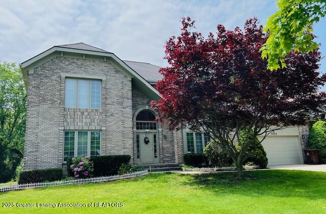This gorgeous home in Spring Lake subdivision in Okemos offers over 3,600 square feet of living space, designed for both comfort and entertainment. It provides ample space for relaxation and privacy. The house features a two-story foyer with tiled flooring, leading to a well-lit interior throughout the day. The kitchen is equipped with Corian counters and an island with bar seating, along with an adjacent breakfast area.